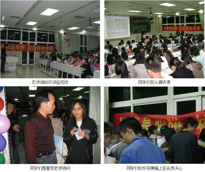 黎沛基老师以风趣的语言,深入浅出地剖析传销的实质,并用大量的案例向同学们讲述了传销和变相传销的危害性。通过这次讲座,同学们对传销活动有了更进一步的了解,对传销的危害有了更深刻的认识,认识到只有认真学习,踏实工作,才能拥有美好前程。
