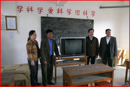 接着热带医学研究所党总支党员一行人又来到了盘寨村小学,村小学校长谢雄应首先介绍了学校情况,然后大家看望了村小学的老师和学生,并赠送一批图书和29寸崭新的创维电视机一台,以方便他们开展学习及文化活动。给一名贫困学生梁家枳(小学四年级学生、兄妹三人,父亲已故、母亲出走,全靠70多岁的爷爷奶奶干活维持生计。)送上了助学金、书包及衣服等慰问品,勉励梁家枳同学好好学习,早日成才。