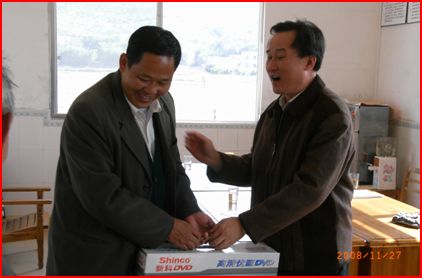 到达盘寨村后,大家不顾旅途的疲惫,在驻镇干部方振聪同志的介绍下,在盘寨村村委举行了与盘寨村党支部互帮互助活动启动仪式并与部分党员座谈。参加座谈会的有盘寨村党支部书记黄日光、副书记谢冲成、妇女主任陈学英等党员,由盘寨村党支部书记黄日光介绍了盘寨村的基本情况:全村有一千七百多人,其中党员有32人,以农业为主。符林春总支书记介绍了开展 "互帮互助"活动的计划,并表达了热带医学研究所希望从长计议,将互帮互助的活动做实的想法。会后,热带医学研究所党总支为该村党支部捐赠了DVD播放机一台及衣物一批。