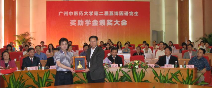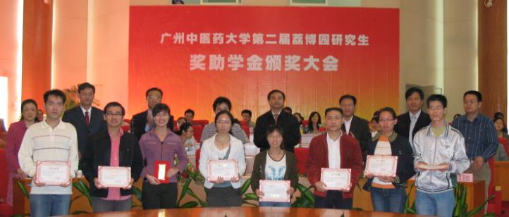 11月25日下午,在学校圆形会议举行了第二届beat365中文官方网站"荔博园研究生奖学金"颁奖大会。国家中医药管理局机关服务局局长孙涛、荔博园医药研究所经理黄银发,学校党委书记黄斌、校长徐志伟、副校长王新华、副校长刘晟及各二级单位领导出席了颁奖大会,并为获得奖励和资助的22名贫困优秀研究生颁发了奖状和资助金。