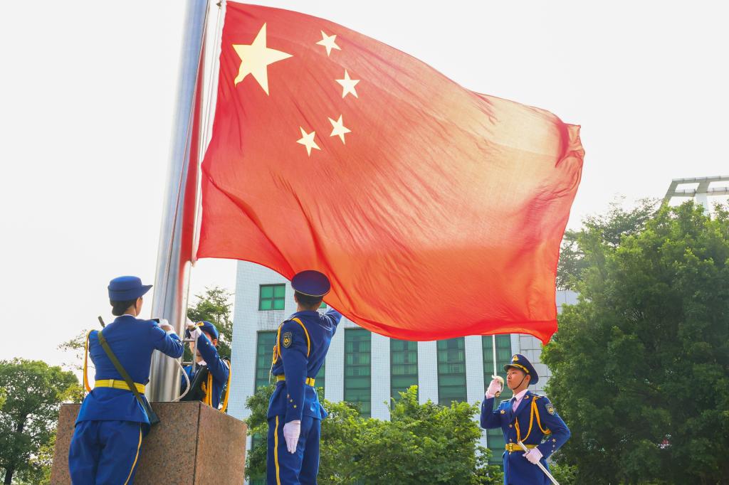 全体师生注目冉冉升起的五星红旗,齐声高唱《义勇军进行曲》,将诚挚的祝福献给党和祖国。鲜艳的五星红旗拥抱晨曦,迎风飘扬在广中医的上空。