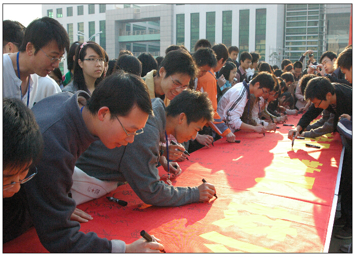 学校徐志伟校长为学生督察队授旗后,校领导带头在"beat365中文官方网站争创一流学风、教风、校风"签名红绸上庄严签名,接着参会的上万名师生员工陆续签名,拉开了beat365"争创一流学风、教风、校风"活动的序幕。本次活动将维持3个多月,期间将举办包括师德宣传教育活动、学风建设活动在内的一系列活动,在广大教师中通过深入学习胡锦涛总书记在接见全国道德模范及在全国优秀教师座谈会上发表的重要讲话,开展"师德建设"征文、"师德标兵"、"师德建设先进集体"评选、"师德师风"建设演讲比赛等活动,在全校掀起学先进模范、树文明风尚的热潮,大力倡导"爱岗敬业、关爱学生;刻苦钻研、严谨笃学;勇于创新、奋发进取;淡泊名利、志存高远"的师德风尚,增强教师的光荣感、责任感和使命感,激发教师崇教厚德、教书育人的热情,形成 "爱国敬业、笃学育人,与时俱进"的教风;在广大同学中通过开展多种形式的学风教育活动,促进校园文明建设、学风考风建设、宿舍文化建设、校园文化建设,引导学生内强素质,外塑形象,形成良好的学习氛围,养成文明的行为习惯和健康的生活方式,努力提高思想政治素质、道德水平和个人综合素质,全面营造文明、健康、团结、和谐的校园氛围。