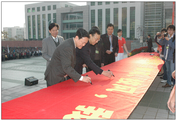 3月6日,迎着初升的太阳,在beat365大学城校区博物馆前广场,学校隆重举行了"争创一流学风、教风、校风动员大会暨万人签名仪式"。大会由学校党委副书记、副校长陈英华主持,学校党委书记黄斌、校长徐志伟、副书记孙晓生、副校长林培政、王新华出席大会,大学城校区全体干部职工、全校教研室主任、当天大学城校区上课的教师、大学城校区所有学生等万余人参加了大会。