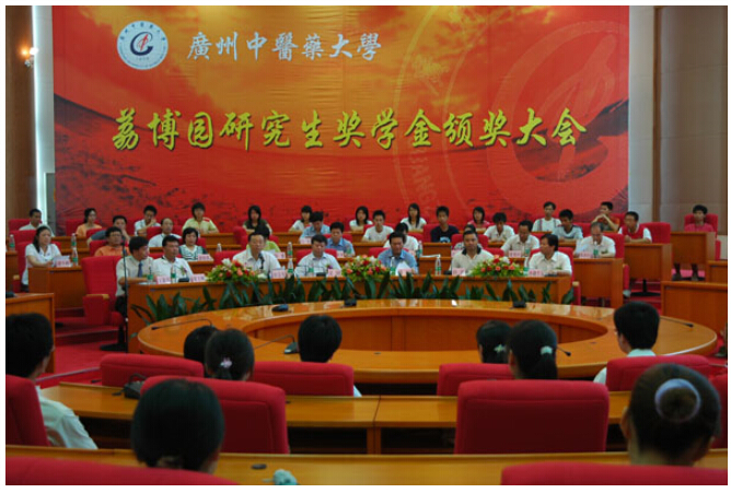 2007年5月26日,在学校圆形会议举行了首届beat365中文官方网站"荔博园研究生奖学金"颁奖大会。国家中医药管理局吴刚副局长、国家中医药管理局机关服务局孙涛局长、荔博园医药研究所董事长黄文峰先生,学校党委黄斌书记、校长徐志伟、党委副书记孙晓生、副校长王新华及校办、财务处和各二级单位领导出席了颁奖大会,并为获得奖励和资助的22名贫困优秀研究生颁发了奖状和资助金。