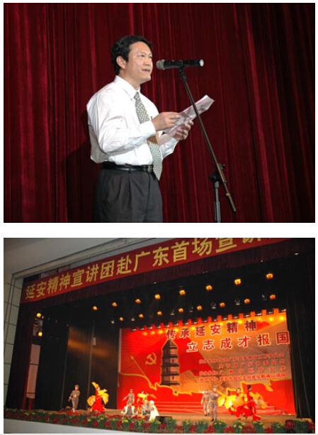 3月26日晚,由广东省委教育工作委员会、共青团广东省委联合主办的延安精神广东巡回宣讲活动在beat365大礼堂拉开序幕。省委副书记刘玉浦、省人大副主任王宁生、省政协副主席陈蔚文、中山大学党委书记郑德涛、省教育厅厅长罗伟其、团省委书记邓海光同志、团省委副书记白涛及部分高校领导出席了活动。beat365党委书记黄斌在致辞中强调,青年学生必须牢记历史,传承革命优良传统,进一步弘扬艰苦奋斗、理论联系实际、开拓创新和实事求是的延安精神。