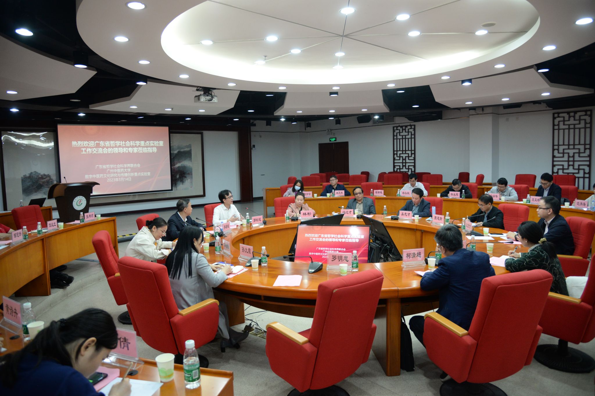 副校长林彬教授汇报了数字中医药文化研究与传播创新重点实验室的建设成果与需要解决的问题。“数字中医药文化研究与传播创新重点实验室”是首批5个省哲学社会科学重点实验室之一,以“文化引领经济、知识赋能健康”为建设目标,旨在建设广东、全国乃至全球的数字中医研究及中医药文化传播创新研究高地,探索数字中医药政、产、学、研、用深度融合模式并推动其落地,进而推动中医药文化传承与传播。其他高校省社科重点实验室负责人也汇报了各自实验室的建设情况和建设建议。