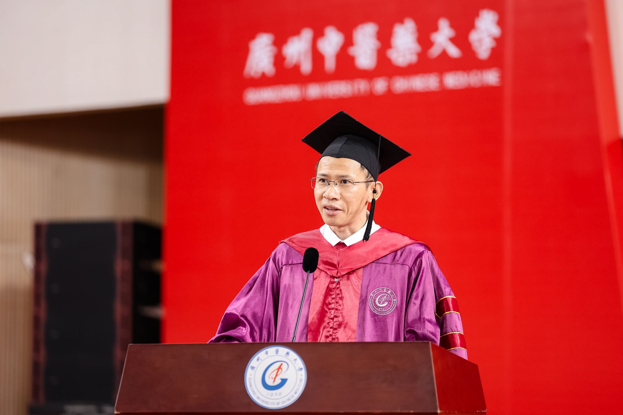 他叮嘱同学们,“酸”,能收、能涩,收敛固涩方显人生从容,面对人生道路上的挫折与迷茫,希望同学们能有宠辱不惊的心理素质和乐观向上的精神状态,从逆境中汲取力量,用坚定的理想信念指引前进的方向;“苦”,能泄、能坚,吃得苦中苦,方能厚实根基,同学们正处于苦练本领、增长才干的黄金时期,要会“吃苦”,在攀登知识高峰中追求卓越,在真刀真枪的实干苦干中成就一番事业,让中医药事业根深叶茂、岐黄之术生生不息;“辛”,能散、能行,行气活血,才能勇攀高峰,祝愿同学们一路高歌猛进,用青年的豪气与热血推动中医药事业实现创新突破,唱响属于自己的青春礼赞;“咸”,能下、能软,软坚散结,人生将愈加平稳,成长需要付出汗水和泪水,希望同学们能继承中医人坚韧不拔的意志,无畏艰险,勇攀中医科学的高峰;“甘”,能补、能缓,成功的喜悦能调和过往的辛酸咸苦,成功从来不是钱权名利,它是实验中的灵光乍现,是救死扶伤的一抹微笑,是从迷茫徘徊到下定决心的坚定步伐,这些甜的背后是辛勤付出,希望同学们能带着对下一次成功的期待,再次出发。