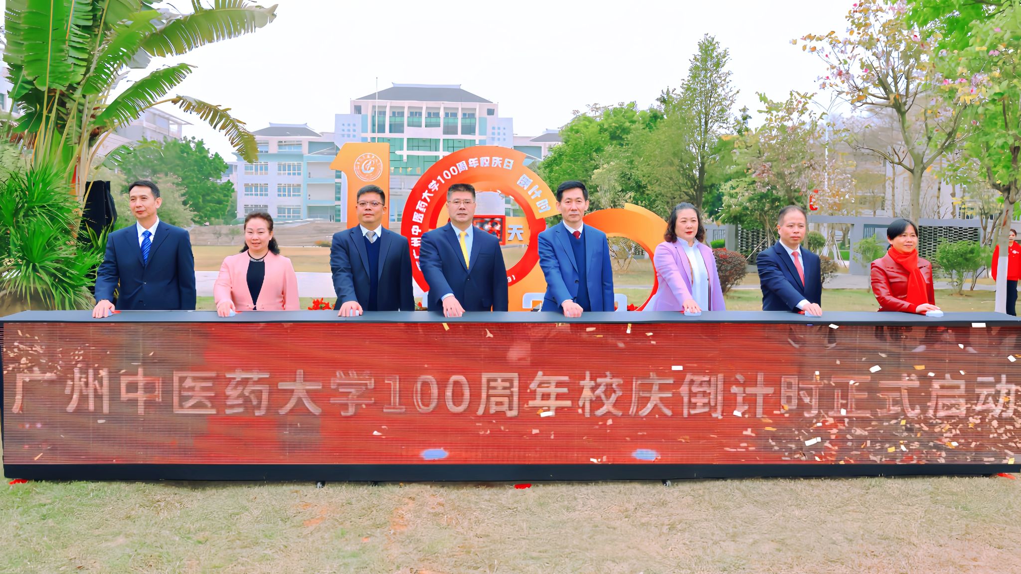 学校领导在百年校庆倒计时牌前合影