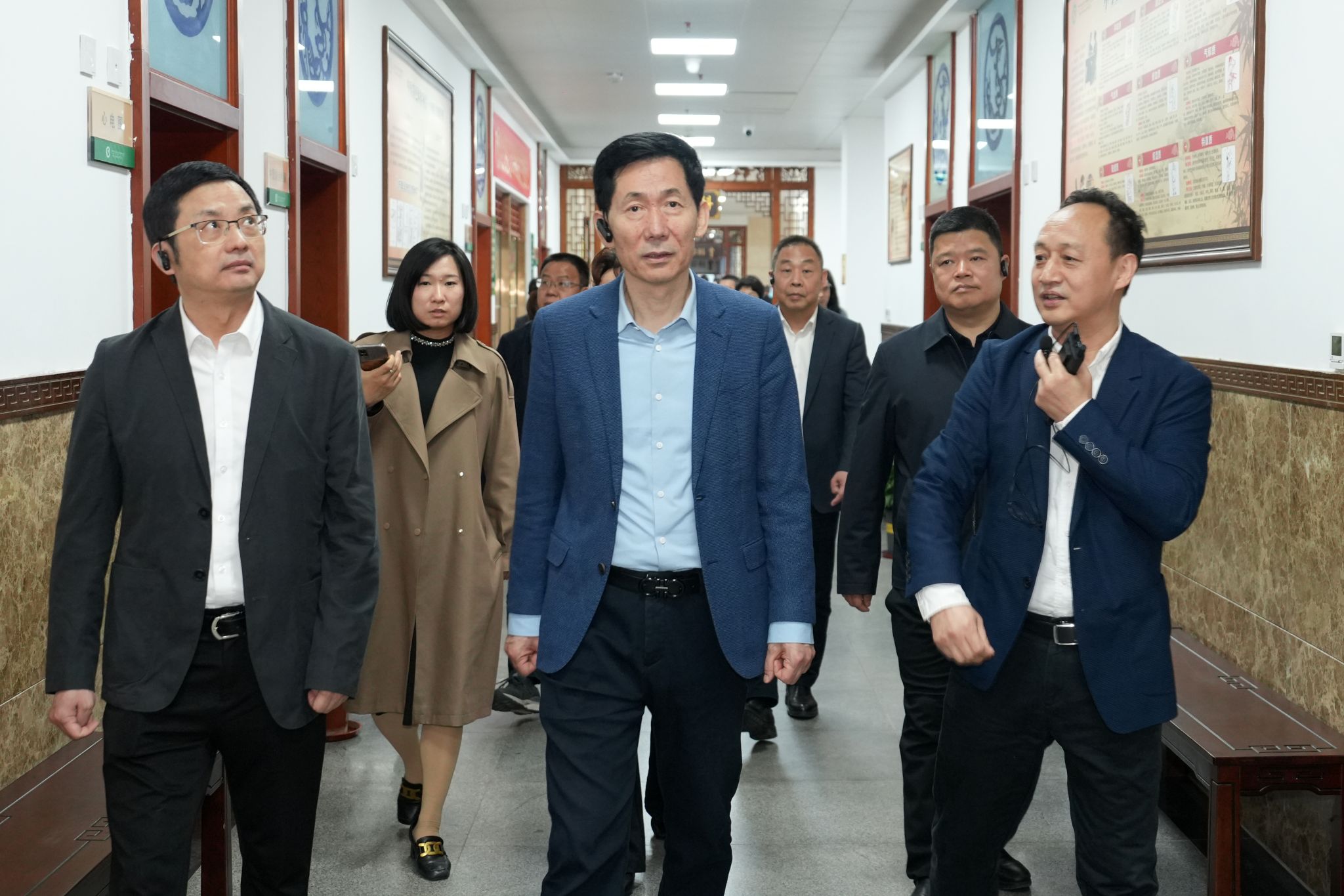 王伟一行先后实地走访了医院门诊大厅、体验中心、仲景馆、名中医传承工作室、中医药文化长廊等地。