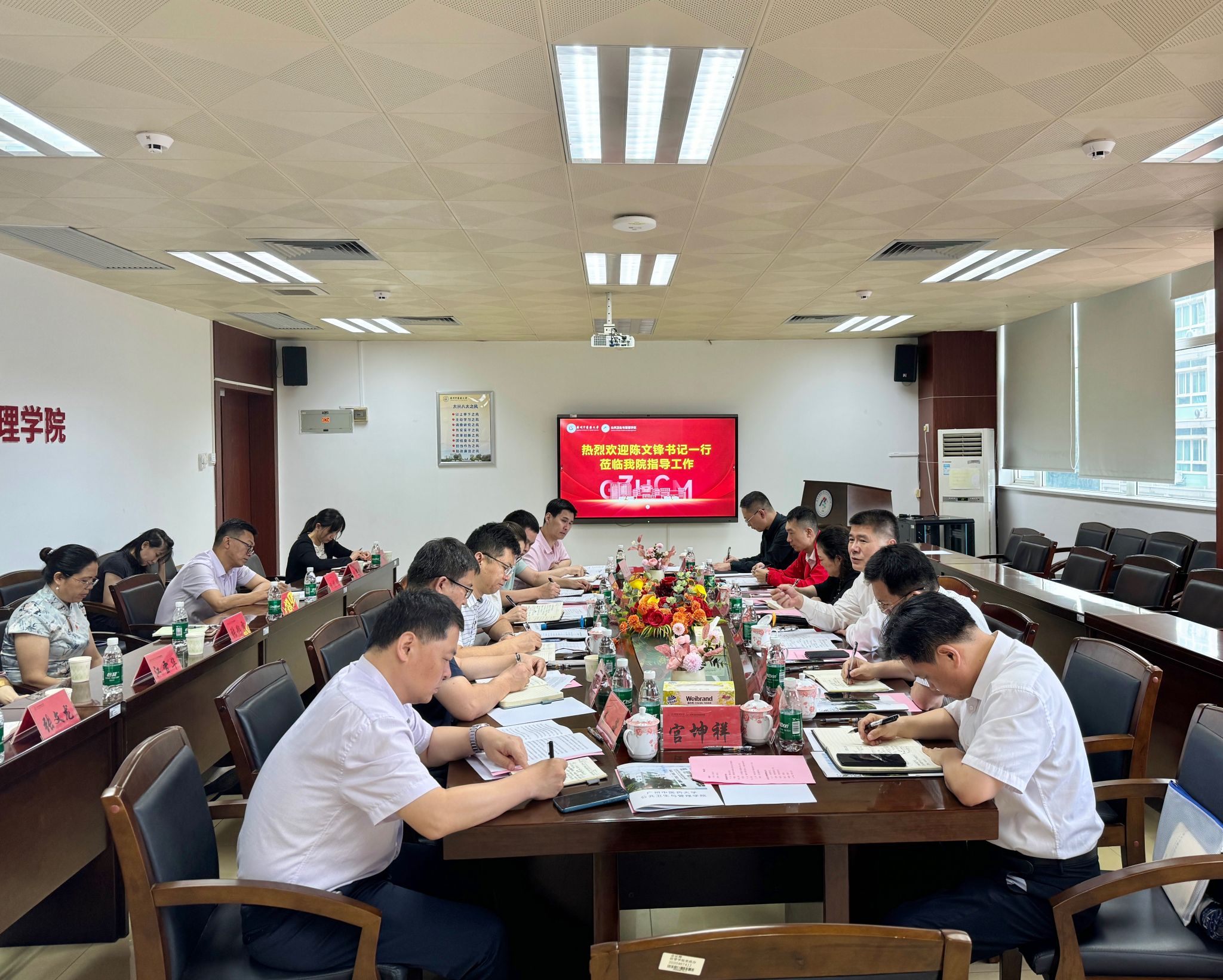 陈文锋认真听取卫管学院领导班子对学院近年来的工作情况汇报,向参加调研的学院基层党组织教工代表了解工作情况,征求对学院、学校建设发展等方面的意见建议,对学院2024届毕业生就业工作进行督导。他在讲话中强调,一是卫管学院党政领导班子要倍加珍惜组织的委托与全院职工的信任,抓实抓好党纪学习教育,深入开展作风建设和师德师风建设,加强班子自身建设,以制度化建设加快健全学院运行管理机制,实现学院治理的规范化运行,推动学院改革发展各项事业不断进步;学院党政领导班子不仅要作团结奋进的表率,在具体业务工作中不断增强教职工的凝聚力。二是要坚持“围绕中心、服务大局”,卫管学院要围绕“双一流”和高水平大学建设目标任务要求,支撑粤港澳大湾区中医药高地建设,统筹谋划学院的学科专业和科研方向的设置与建设,整合各类平台资源,提高人才培养质量,谋划建强人才队伍,积极服务区域经济社会发展,争当学校高质量发展的“发动机”。三是要以学校建校办学百年为契机,要主动拓展社会多方资源支持学院高水平建设,梳理总结好建院25周年来的发展历程及经验。