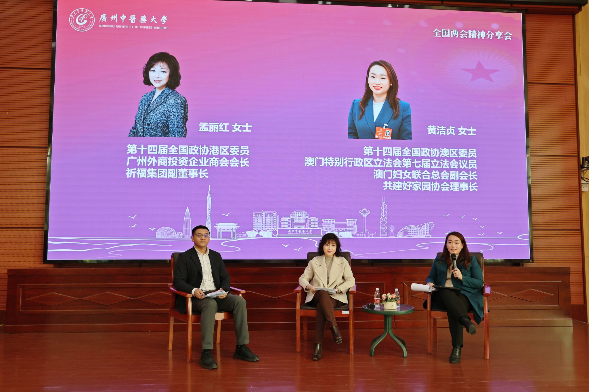黄洁贞委员深入解读全国两会的重要意义,她指出,作为党的二十届三中全会后的首次两会,今年全国两会肩负着“十四五”规划收官和“十五五”规划奠基的重要使命。黄洁贞介绍了澳门医疗行业现状,强调在横琴粤澳深度合作区的政策优势下,粤港澳协同发展中医药产业前景广阔。她表示,国家始终将澳门发展纳入民族复兴整体布局,澳门青年应以“胸怀‘国之大者’、心系湾区建设”为自觉,充分利用学校在中医药传统文化传承与实践中的优势平台,厚植家国情怀,提升专业素养,为推进中国式现代化贡献力量。
