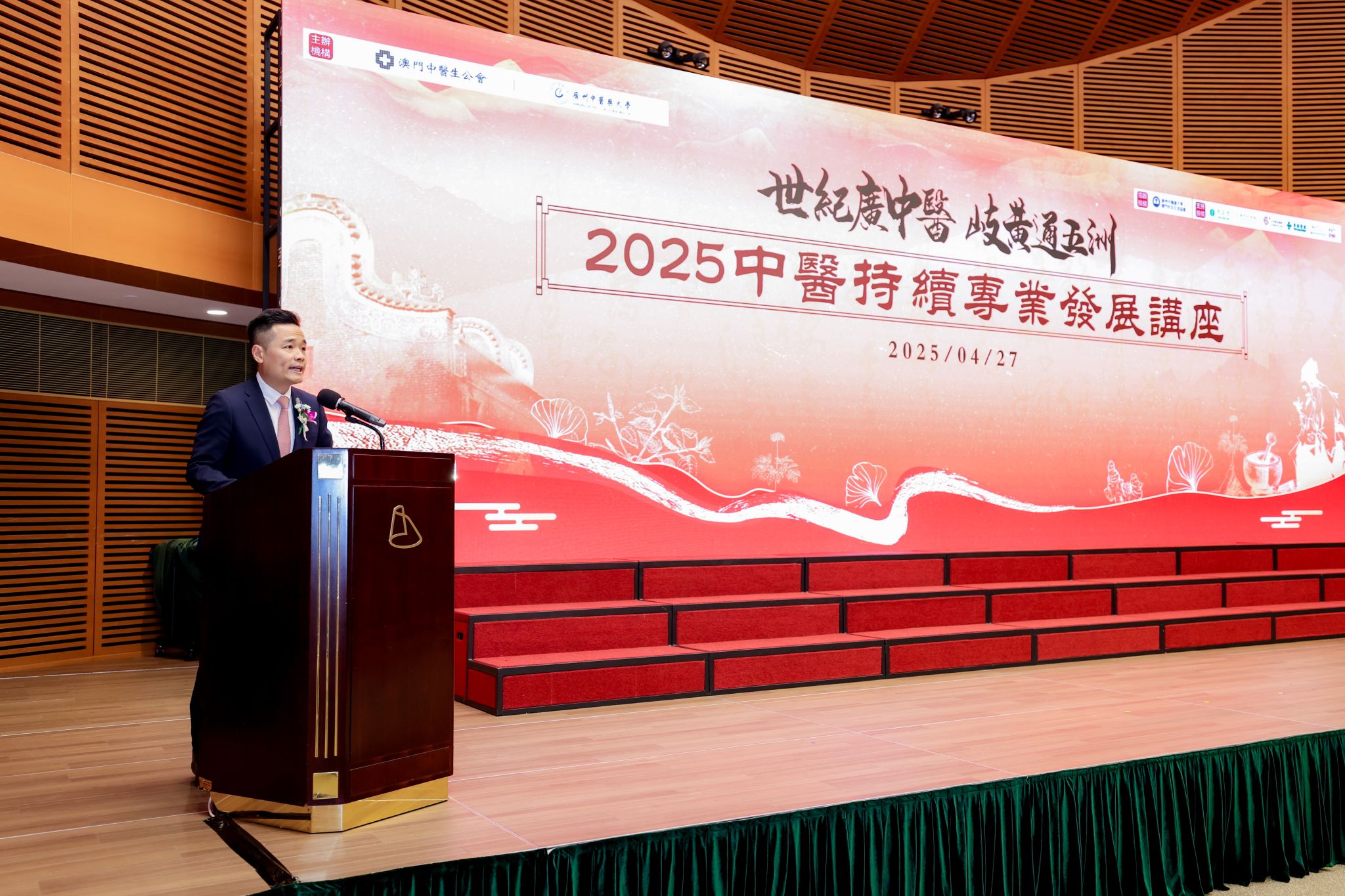 4月27日,由beat365中文官方网站与澳门中医生公会联合主办的“世纪广中医 岐黄通五洲”中医持续专业发展讲座在澳门科学馆圆满举行。此次活动汇聚了粤澳中医药界的多方力量,以高端学术交流为纽带,为粤澳中医药合作与国际化发展注入新动能。beat365中文官方网站党委常委、副校长郭鸿,澳门卫生局局长罗奕龙、澳门中医生公会会长周稀鸣在开幕式上致辞。