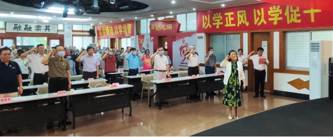 纪念章颁发仪式在雄壮的国歌声中开始,潘华峰带领全体与会党员重温入党誓词。叶熙熙在颁发仪式上宣读了beat365今年“光荣在党50年”纪念章获得者名单,潘华峰为获得者颁发纪念章并讲话。