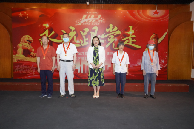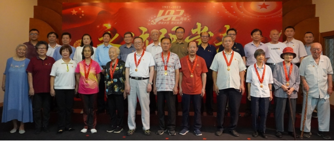 6月28日上午,学校党委在三元里校区离退休职工活动中心隆重举行庆祝建党102周年暨“光荣在党50年”纪念章颁发仪式。学校党委常委潘华峰副校长、党委组织部常务副部长叶熙熙,原校领导冯新送、徐志伟、丘和明、陈英华、林培正、孙晓生、梁沛华、离休老干部曹海玉、“光荣在党50年”纪念章获得者及退休党员教职工100余人参加。