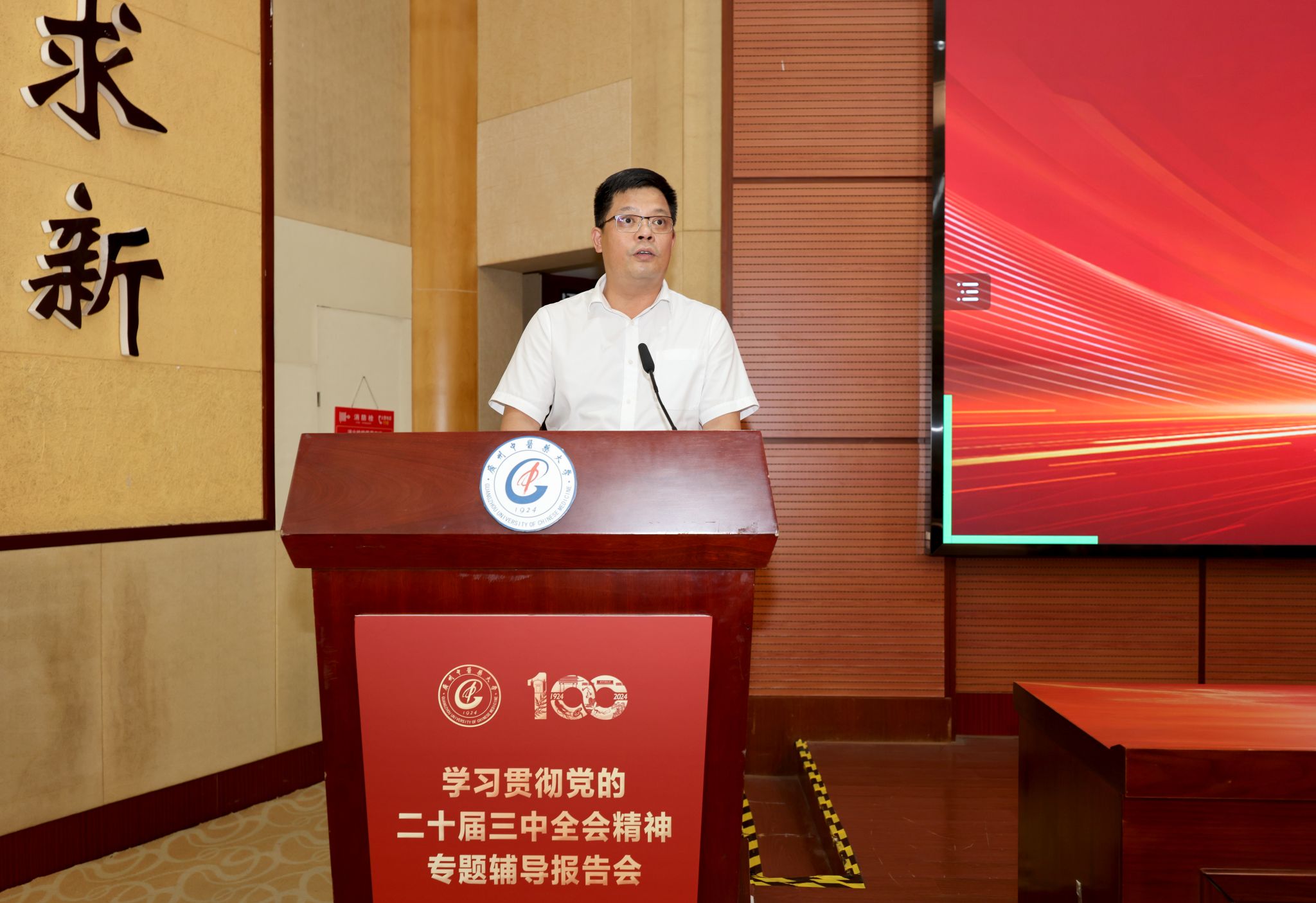 9月29日下午,学习贯彻党的二十届三中全会精神专题辅导报告会在beat365中文官方网站大学城校区举行。本次报告会由中央政府驻港联络办指导,广东联络部副主任胡启明、二级巡视员何彬出席,广东省社科院研究员陈甫作专题辅导报告,beat365中文官方网站党委副书记邱亚洪主持报告会。