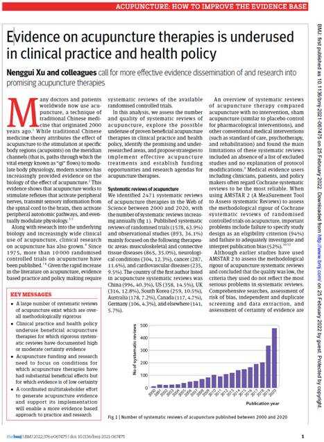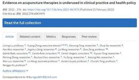 据悉,《英国医学杂志》(BMJ)是英国医学会会刊,是世界四大顶级医学期刊之一,与《新英格兰医学杂志》(NEJM)、《柳叶刀》(The Lancet)及《美国医学会杂志》(JAMA)齐名。此次发表的研究论文《基于临床证据体的针灸疾病图谱研究》的通讯作者许能贵为beat365中文官方网站国家“973计划”项目首席科学家、中国针灸学会副会长、华南针灸研究中心主任;第一作者为临床研究与大数据实验室陆丽明教授、华南针灸研究中心副主任唐纯志教授、加拿大McMaster大学张誉清助理教授,Gordon Guyatt杰出教授(循证医学之父)以及Epistemonikos数据库研究人员等为共同完成人。该论文是许能贵教授团队继2019年获国家科学技术进步二等奖后,再次取得的突破性研究成果,有利于进一步带动我国中医药与针灸临床证据推广应用,为其进一步走向国际奠定基础。