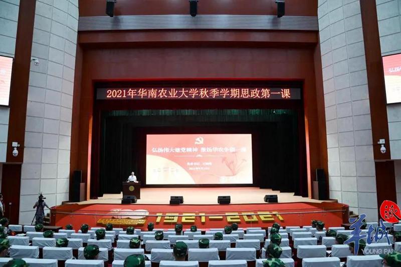 华南农业大学“思政第一课”采用线上线下相结合的方式进行,主课室设在丁颖礼堂,各学院设130个分课室集中收看直播。“伟大建党精神如何激励鼓舞华农人创造百年辉煌?”“在新征程中,伟大建党精神如何引领华农学子实现人生梦想?”华农党委书记王斌伟带领学子思考立足当下该如何回顾过去与畅想未来,现场设置提问交流环节,新生们踊跃就课堂内容进行讨论。