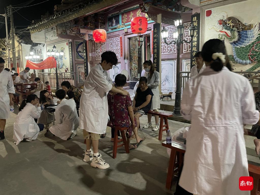严日迅表示,三下乡的经历是非常充实忙碌的。白天小队的各个成员在村里走街串巷,为当地的村民开展医疗调研;晚上六点许,这群大学生便陆续聚集在村里的祠堂门口,从祠堂里拿出红木桌椅,安置自带的医疗服务器材,拉起广中医“汕医行”三下乡服务队的横幅,开始忙碌的义诊工作。