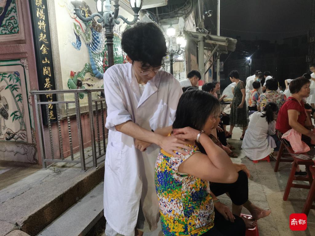 在团队中,严日迅主要负责推拿工作。这个项目对手劲要求很大,加上每天的义诊工作强度很高,“头一两天帮人推完之后经常手抖,大拇指都有些抽筋。”