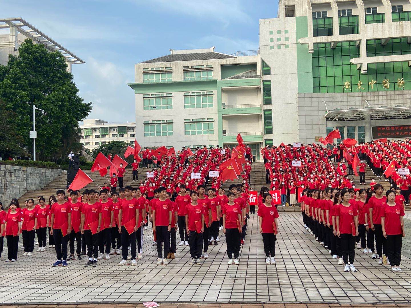参加活动的师生手执党旗、国旗,身上贴着五星爱心贴纸,口罩上印着“永远跟党走”的图案,党员佩戴党徽,现场气氛在一片红色的海洋中更显热烈、喜庆而庄严。升旗仪式开始前,学校党委书记张建华、校长王伟等学校领导与师生一起大合唱,把歌声献给党,从《我们走在大路上》到《学习雷锋好榜样》,满怀激情的歌声响彻校园,洋溢着对党和国家浓浓的爱意。