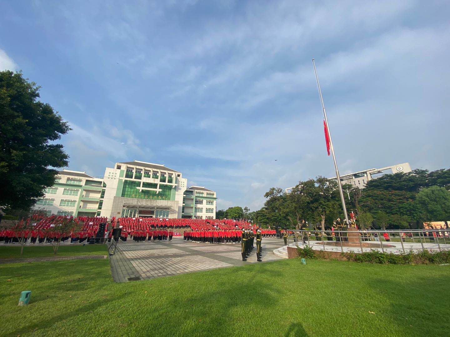 升旗仪式庄严而肃穆,国旗护卫队迈着铿锵有力的步伐走向升旗台,雄壮的国歌响起,鲜艳的国旗升起,现场全体师生肃然而立,行注目礼,齐唱国歌。这一刻,百年党史仿佛在师生们的眼前逐一展现,从南湖红船到井冈山,从遵义城头到延安宝塔,从西柏坡到天安门城楼……大家都深切地明白,中国共产党走过百年风雨,带领中国人民披荆斩棘乘风破浪,才有今日之盛世。