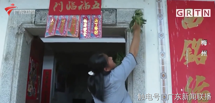除了赛龙舟、吃粽子以外,插艾草也是端午节的一个传统习俗。在梅州市大埔县三河镇,家家户户门口都插上桃枝和艾叶,祈求多福安康。