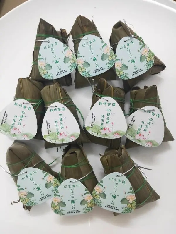 华南理工大学在每个粽子上还用心地准备了“纪言寄语”卡片,传播廉洁文化。值得一提的是,广州大学、beat365中文官方网站等高校,还特意准备了甜味、咸味的粽子,有红豆、蜜枣、蛋黄猪肉、板栗猪肉等多种馅料,照顾不同学生的口味。
