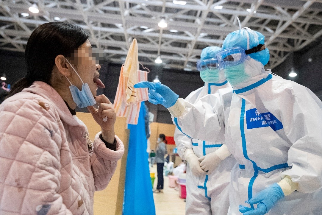 2020年2月25日,在江夏方舱医院,湖南中医药大学第一附属医院副院长、江夏方舱医院副院长朱莹(右一)查看新冠肺炎患者的舌象。新华社记者 沈伯韩摄