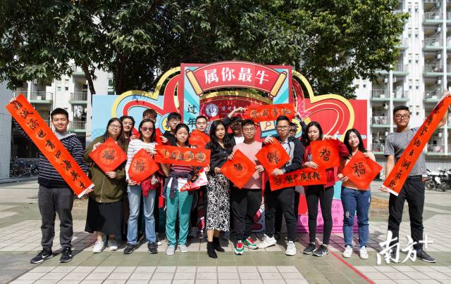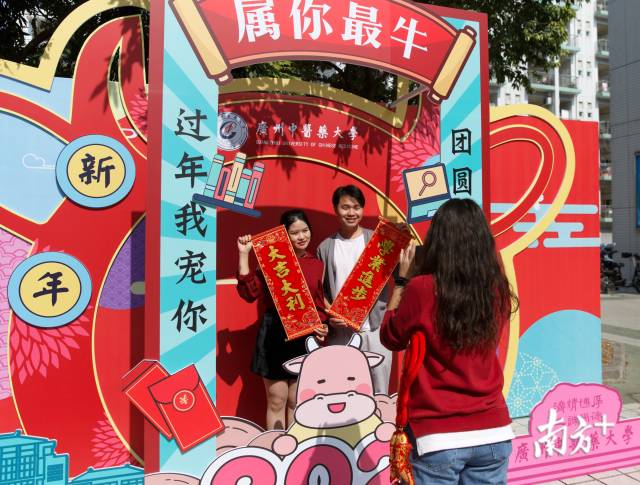 挥墨写春联,抽奖攒福气。学校还为学生提供新年照棚拍服务,准备了一批新年道具供拍照使用。广场一侧,同学们高举着自己写好的春联、福字,在镜头前摆出各式各样的动作。