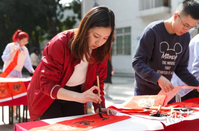 从写到贴,写春联每一步都要亲力亲为,这给来自香港的卢素仪一种完全不同的体验感,她打算把福字贴在宿舍门口,增添一丝过年气氛。