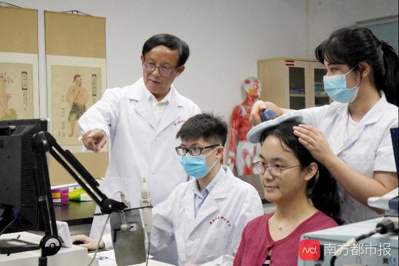 许能贵继续往前走,这里是华南针灸研究中心,也是广东省高等学校实验教学示范中心。2015年挂牌成立,许能贵带着自己的团队,从一穷二白做到全国范围的影响力。