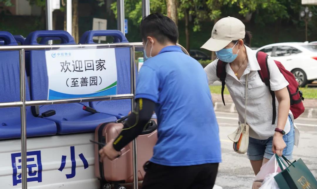 学校在返校报到点还设置了行李消毒区、洗手区、口罩更换区、临时隔离等候区和应急处置区等,为同学们的健康安全保驾护航。为方便学生搬运行李,各校区(园)还安排了接驳车将学生送返宿舍。学生到达宿舍后由宿管员根据返校名单进行身份核验后即可入住。