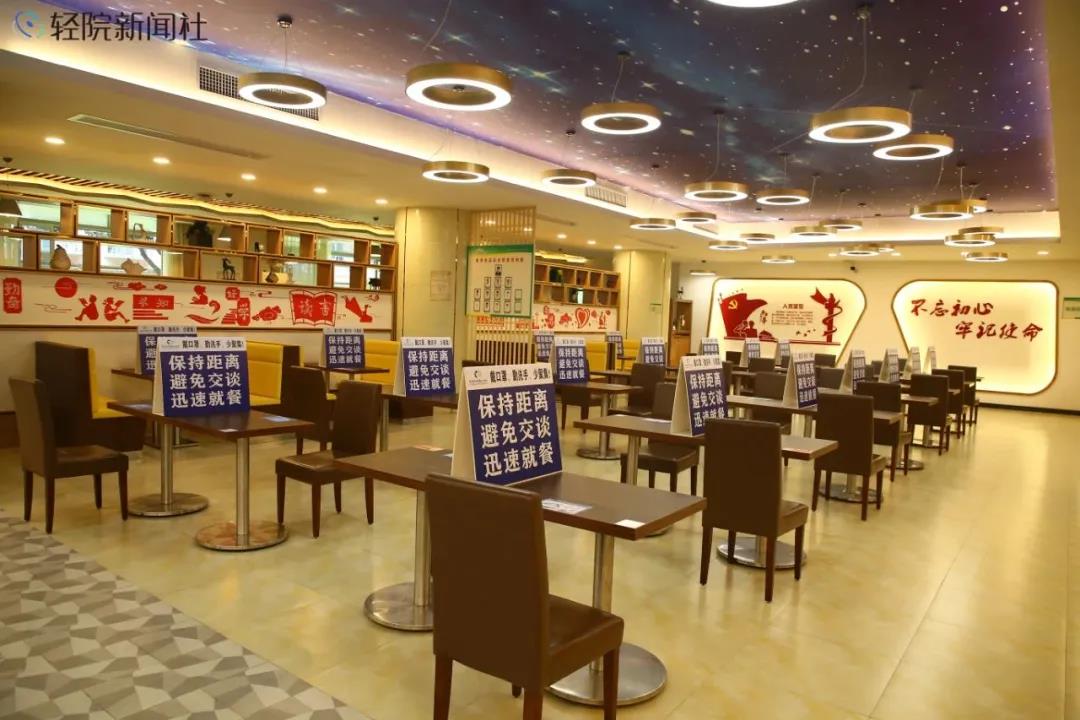 饭堂门口处设有消毒脚垫进行鞋底消毒,随后经检测体温,再按地面标识有序排队点餐。餐桌上张贴了“同向而坐”的标识提醒师生按标识入座,一人一桌、间距1.5米进餐,同时鼓励自备饭盒,回宿舍食用。