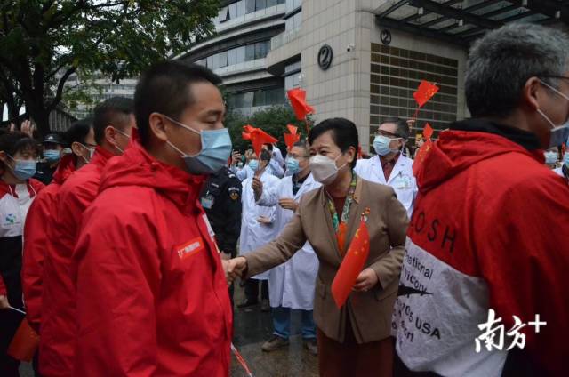 为了迎接英雄归来,广东省人民医院耿庆山书记、余学清院长率领在院院领导为他们举行了简短而热烈的欢迎仪式。队员们的家属也来到医院迎接亲人,“欢迎爸爸妈妈回家”一月余未见爸爸妈妈的子女们也终于能够送上大大的拥抱。