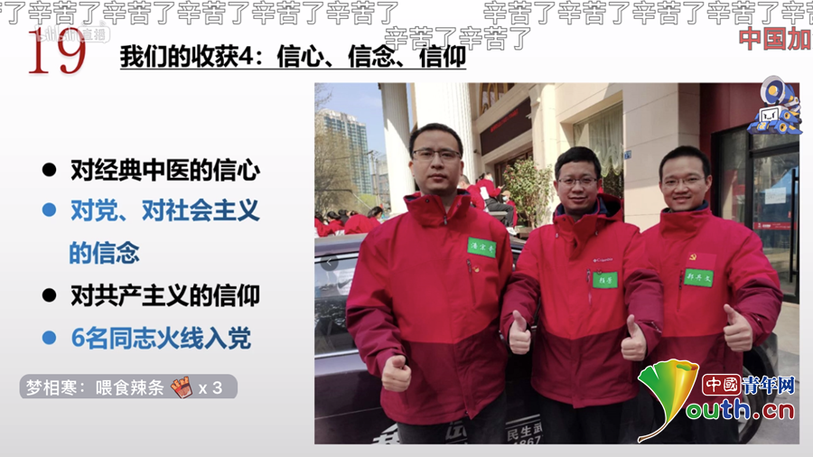 据了解,英雄归来并亲自讲团课的消息传开时,很快刷爆广中医的朋友圈,因疫情还未能回校上课的同学们直言对这节“云团课”充满期待。在团广东省委的推动下,团课受到更多网友关注,大家纷纷进入直播间围观旁听,在线人数很快就突破12万。课堂上,同学们不断用弹幕表达着对战疫英雄的崇敬、对党和国家的热爱,并积极提问与老师互动,结束时仍然依依不舍,纷纷在朋友圈写下自己上课的感受: