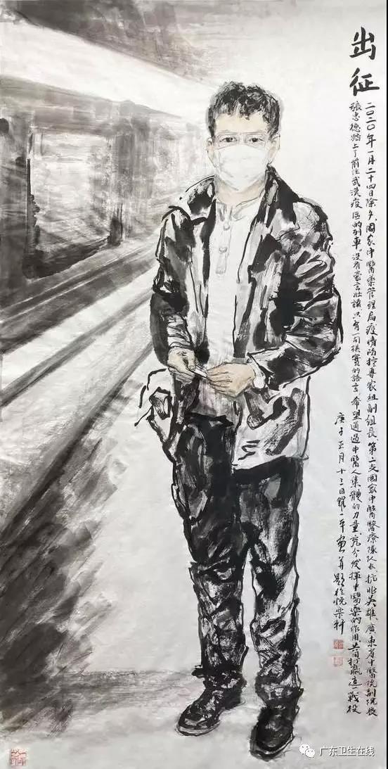▲广东省美术馆协会会长、广东省中国画学会副会长罗一平根据张忠德创作的作品《出征》