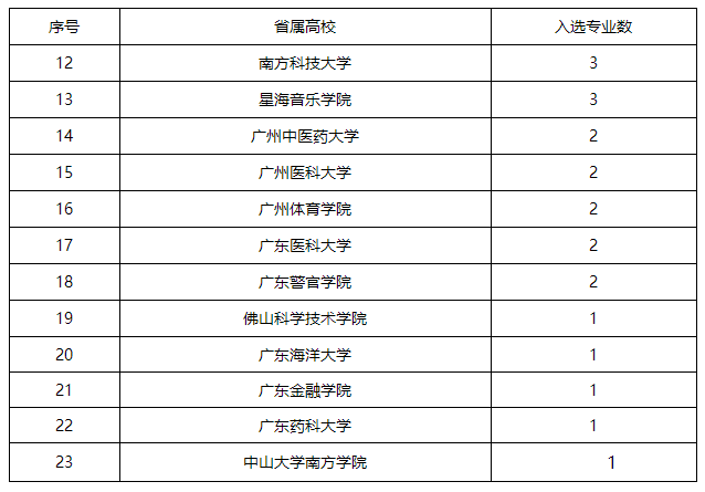 本次教育部认定的首批国家级一流本科专业建设点中,广东省属的综合性院校和特色院校等各类型高校均有专业入选,涵盖11个学科门类、57个专业类、101种专业,体现了本科专业建设的整体水平和综合实力。本轮广东省属高校入选的专业名单中,理工科专业数量最多,达60个,占比38%。这是2016年我省启动高水平理工科大学建设以来,加强理工科专业建设的又一成果和体现。