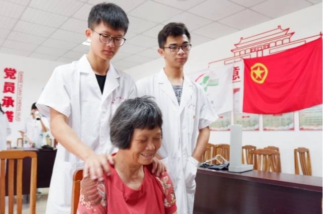 学生为老人推拿按摩