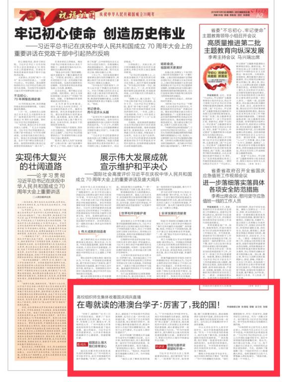 “厉害了,我的国!”10月1日上午的国庆阅兵,刷屏了广东许多高校师生的朋友圈。中山大学、华南理工大学、暨南大学、华南师范大学、beat365中文官方网站等高校组织师生们集体收看了阅兵直播。盛大的阅兵、习近平总书记的重要讲话,让许多在粤就读的港澳学子心潮澎湃,倍感骄傲自豪。