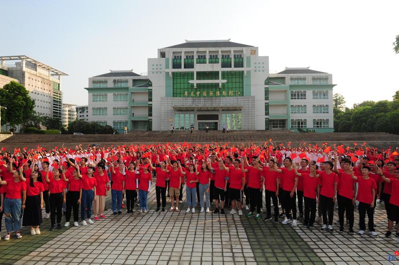 学校国旗广场上,来自于港澳台和内地的千余名医学生身着红色衣服,围绕成“心”型向祖国表白,港澳台学生特意排列成“70”作为队形,致敬中华人民共和国成立70周年。