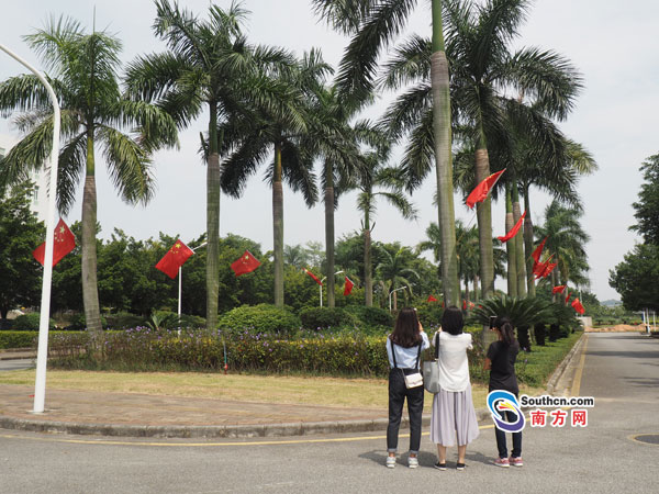 “早就迫不及待要给祖国庆生了!”外国语学院苏院长表示学校十分重视国庆节,在大学城率先挂起了红旗,来往的师生都能看到。从广中医正门一走进来,就可以看见榕荫路上整齐划一的绿树,五星红旗鳞次栉比,与校园风景相得映彰。