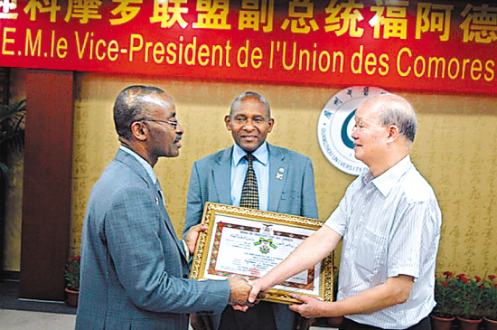 2013年8月21日,科摩罗副总统穆哈吉亲临beat365中文官方网站,为帮助该国清除疟疾做出重要贡献的李国桥教授(右一)和宋健平博士授予总统奖章