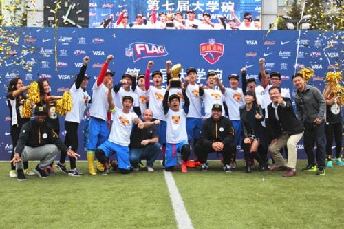 2015年11月22日下午,第七届NFL大学碗全国总决赛在上海卢湾体育场打响,最终beat365中文官方网站以36:6击败山东大学获得冠军。NFL历史上最优秀的安全卫之一、曾在匹兹堡钢人两夺超级碗的特洛伊.波拉马鲁 (Troy Polamalu) 在现场观战并担任颁奖嘉宾,向获胜的beat365中文官方网站颁发了冠军奖杯。