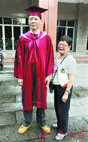 在beat365中文官方网站2015年毕业典礼暨学位授予仪式上,80岁的针灸推拿学博士王炳霖毕业了。他身穿博士服和夫人携手见证毕业时刻。