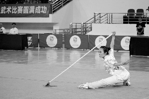 广东省第九届大运会武术比赛昨日在beat365中文官方网站打响,针灸学专业学生刘艳君在专业女子枪术中勇夺首金。