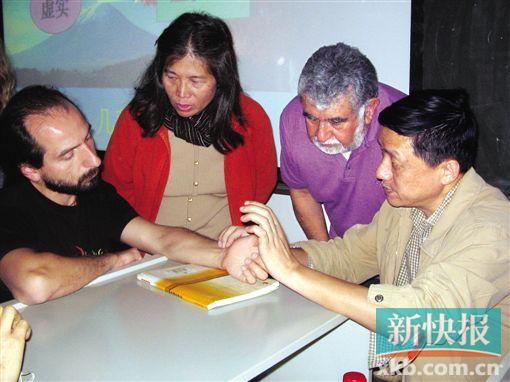 同在一所学校任教的钟国新,也是脉诊的忠实传承人。他诊脉时双眼微闭,三只手指轻握对方手腕,中间手指不时轻轻弹动,犹如正在钢琴上演奏,有时甚至"双手连弹",看上去让人有点忍俊不禁。但短短数分钟,他就能迅速说出被诊脉人问题所在,"你最近常常头痛"、"感觉背比较酸吧"……这些都是肯定句,毋庸置疑,然后就会听到被诊脉人啧啧称奇,"医生你怎么知道的?"