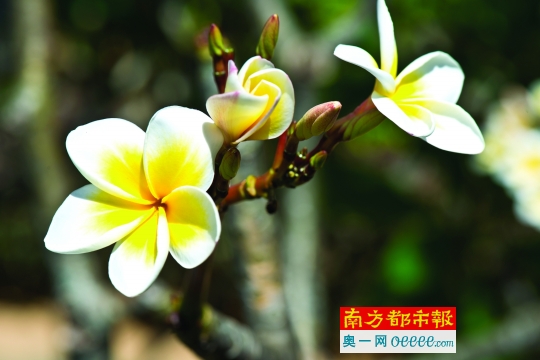 4月开始,广州城里的鸡蛋花就次第开放,鸡蛋花的花瓣中部鹅黄,四周白色,就如一个煮熟鸡蛋的颜色,很稚嫩的样子。除了"鸡蛋花"这个名字,它还有"缅栀子"、"印度素馨"等美丽的名字。