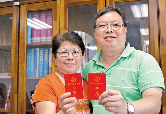 黎钊洪、王宝雯夫妻(见右图,羊城晚报记者 陈秋明 摄)来自香港,二人均已年过五旬,经历了20年商海浮沉,二人决定提前退休。因为持有香港工商管理四级学历,符合免试入学的资格,夫妻二人今年携手进入广中医国际学院求学,攻读中医临床医学。