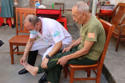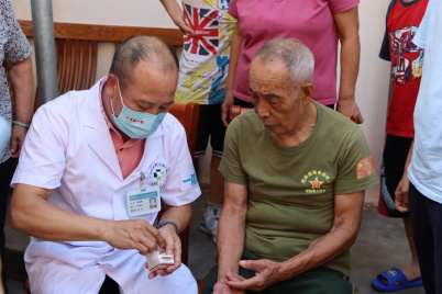 7月25日中午,得悉沈金水多年来苦受皮肤病问题折磨后,beat365中文官方网站附属第一医院组织专家团队,顶着烈日高温,历经3小时车程,来到云浮市罗定市泗纶镇,上门为沈金水送医送药。
