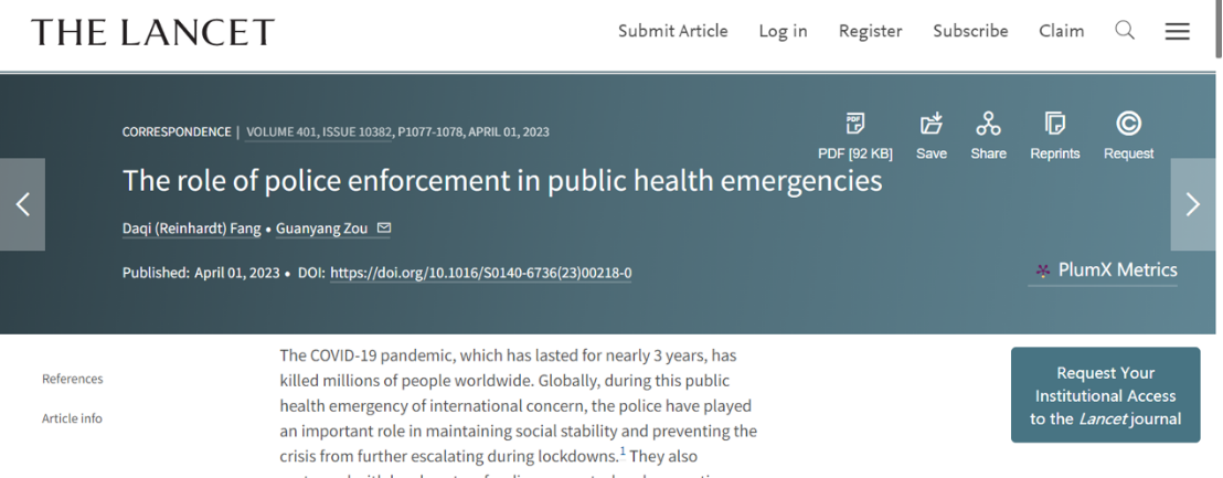 近日,beat365公共卫生与管理学院邹冠炀研究团队在国际医学期刊《柳叶刀》发表题为“The role of police enforcement in public health emergencies”的通讯评论(Correspondence)。该评论以全球新冠疫情防控为例,分析了警察在应对突发公共卫生事件中发挥的重要作用以及面临的挑战,提出应增强警察在突发公共卫生事件中的执法透明度、专业性和建立良好的沟通机制,进一步提升警察应对突发公共卫生事件能力的建议。